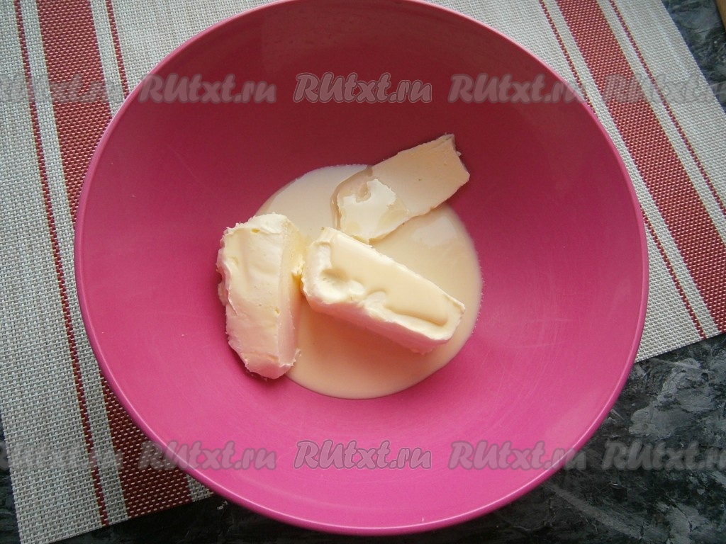 Сливочное масло предварительно нужно достать из холодильника и оставить его при комнатной температуре на 2-3 часа. В миску поместить размягчённое масло, влить сгущённое молоко.