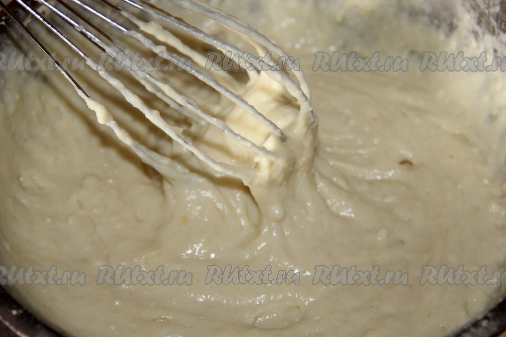 Затем добавляем постепенно муку. Консистенция должна быть густой, чтобы тесто не выливалось с ложки, а падало. Когда муку добавили и тесто хорошо взбили, добавляем соду и хорошенько все смешиваем до однородной массы. Тесто для пышных оладушек готово!