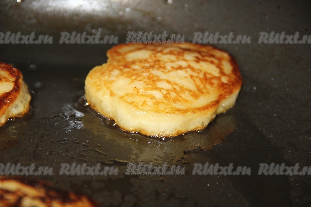 Жарим оладьи на среднем огне с двух сторон, налив предварительно на разогретую сковороду растительное масло.
