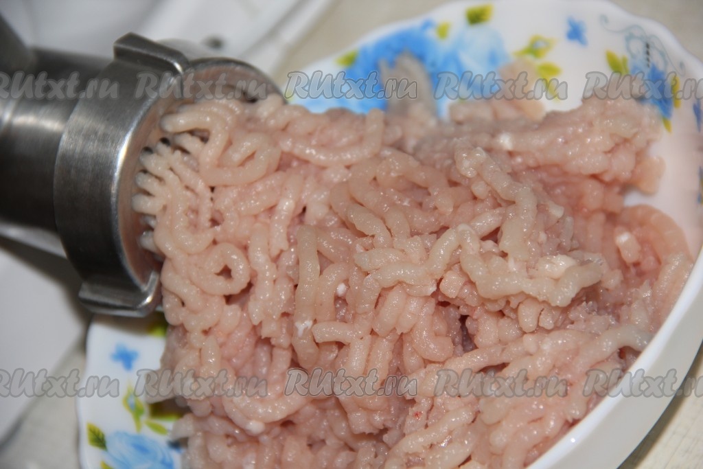 Пропустить кусочки куриного мяса через мясорубку.