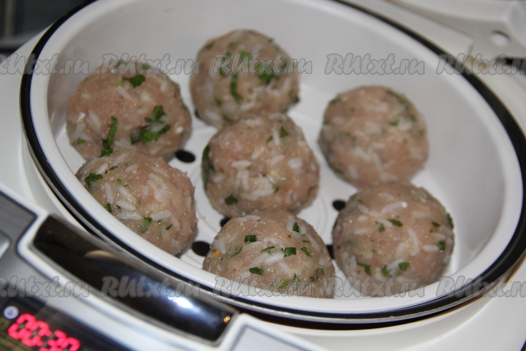 Выставить режим мультиварки "На пару" на 30 минут, готовить куриные тефтели под закрытой крышкой до звукового сигнала.