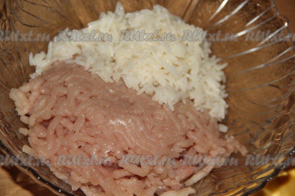 Соединить фарш и остывший варёный рис.