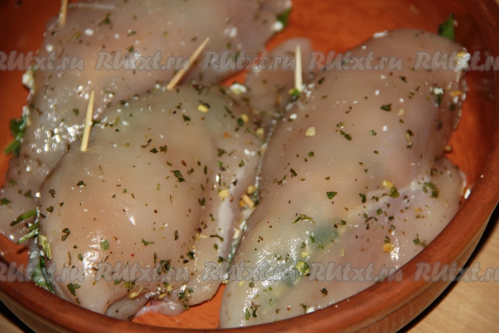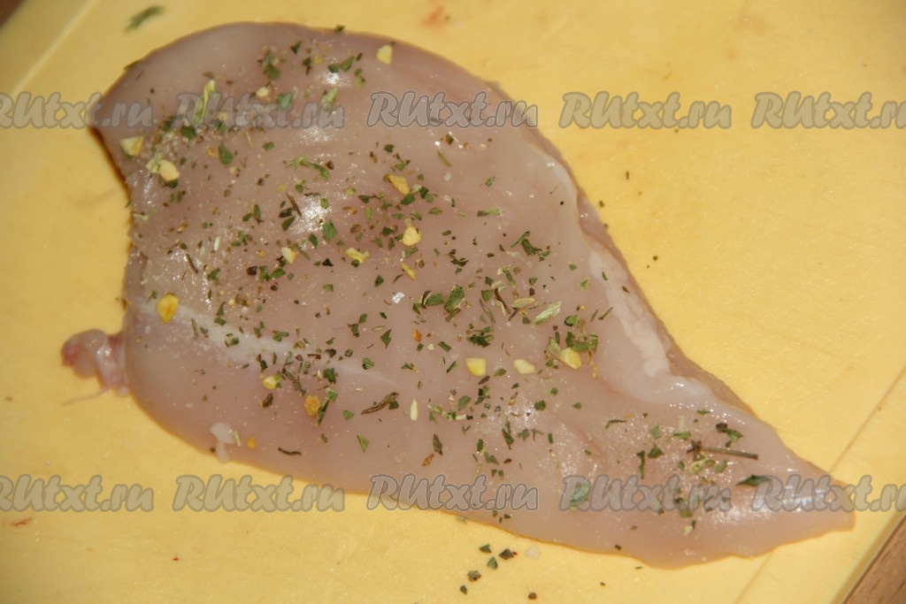 Куриное филе обвалять в травах и специях, посолить по вкусу.