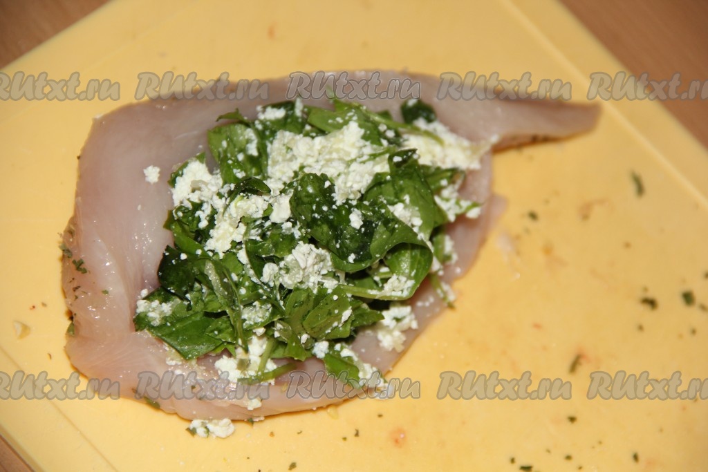 Наполнить "кармашек" в курином филе смесью творога и зелени.