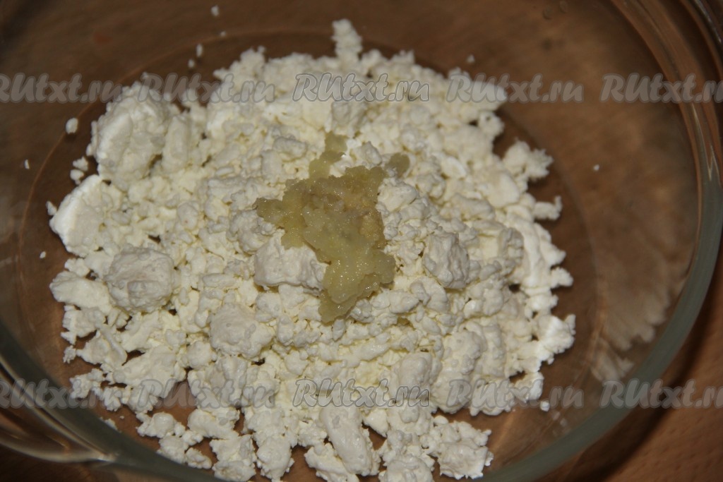 Мякоть кабачка, очищенного от кожуры и семечек, натереть на мелкой тёрке и добавить к творогу с чесноком, перемешать творожную массу. Если нет кабачка, то можно приготовить и без него.