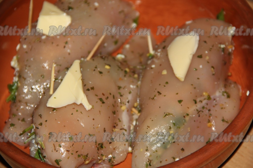 Положить кусочки масла поверх мяса. Поставить форму с куриным филе, фаршированным творогом и зеленью, в разогретую духовку и запекать минут 30 при температуре 200 градусов.