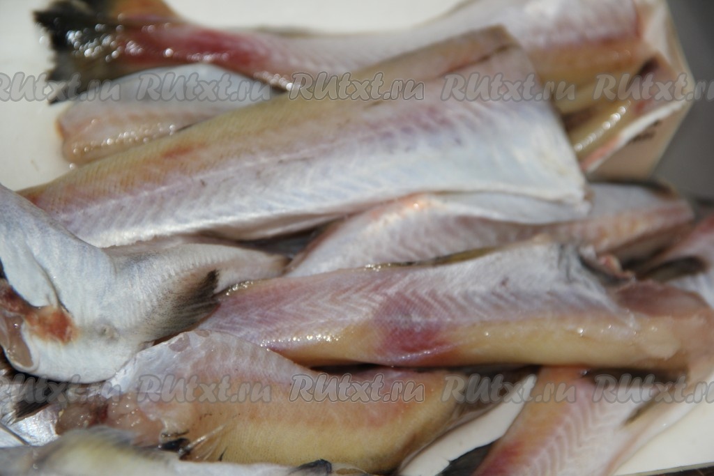Минтая разморозить при комнатной температуре, промыть под водой, удалить голову, внутренности и чёрную плёночку внутри брюшка, отрезать плавники и хвост.