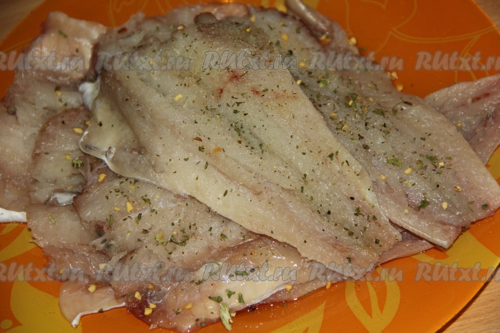 Филе минтая посолить, по желанию, добавить специи для рыбы.