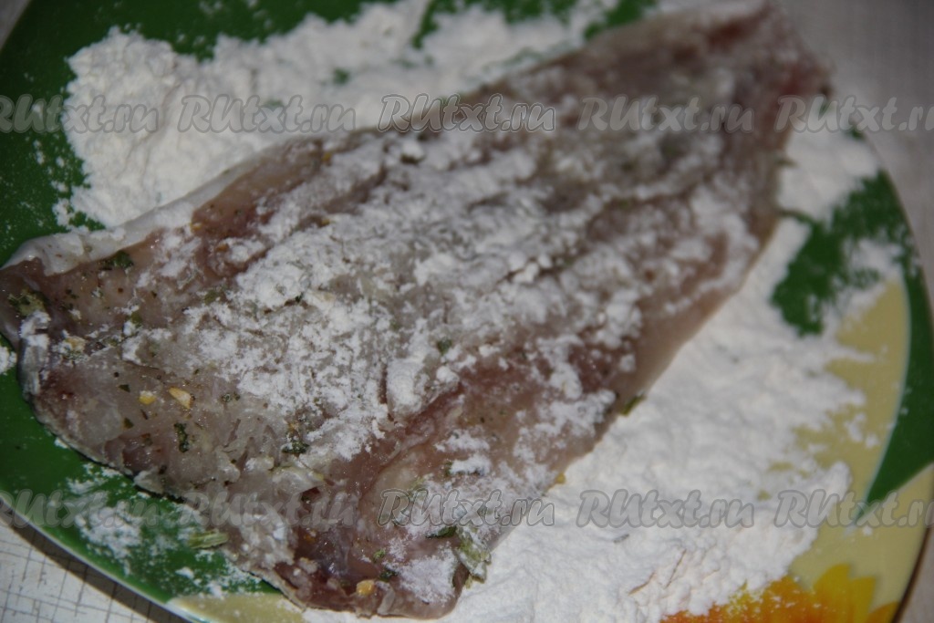 Обвалять филе минтая в муке со всех сторон.