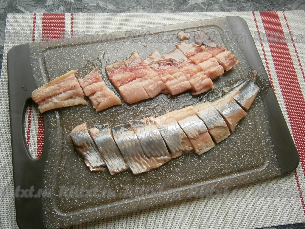Нарезать филе сельди на порционные кусочки.
