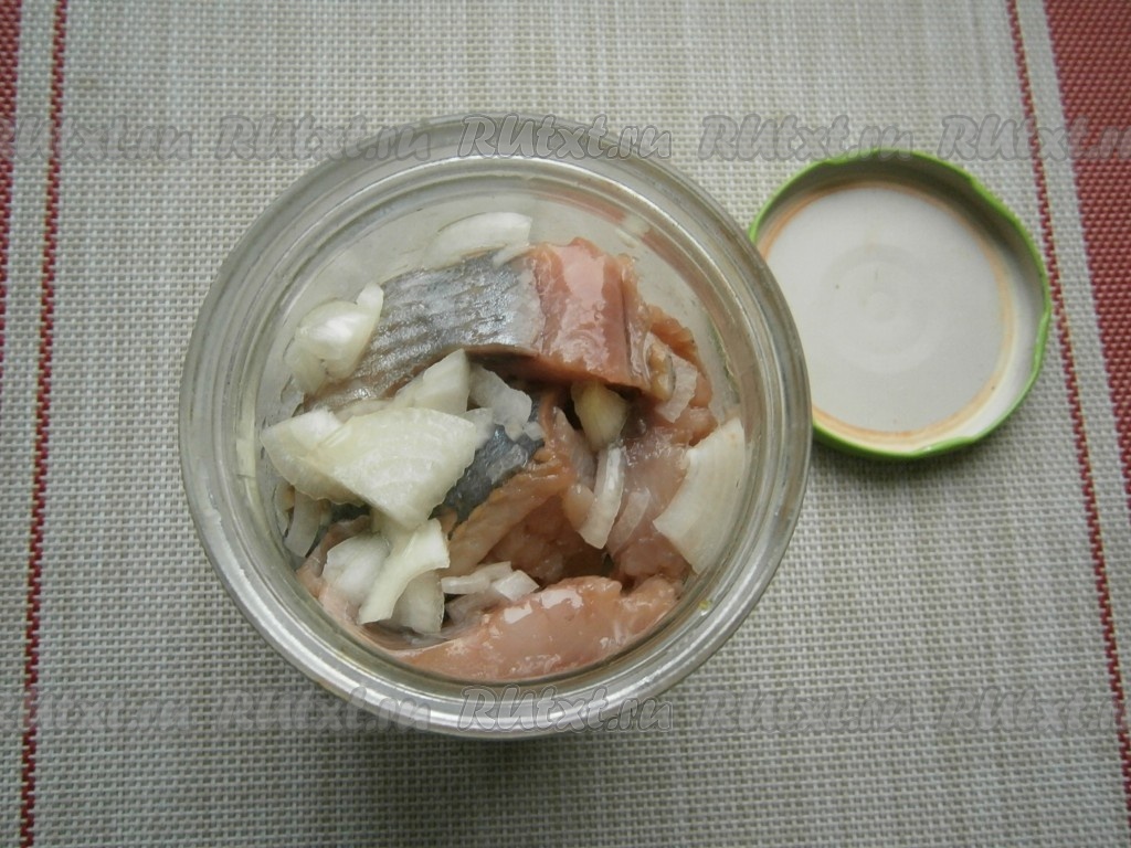 Прикрыть банку крышкой и оставить при комнатной температуре на 1,5 часа. После этого кусочки селёдки достать из банки и обсушить бумажными полотенцами.