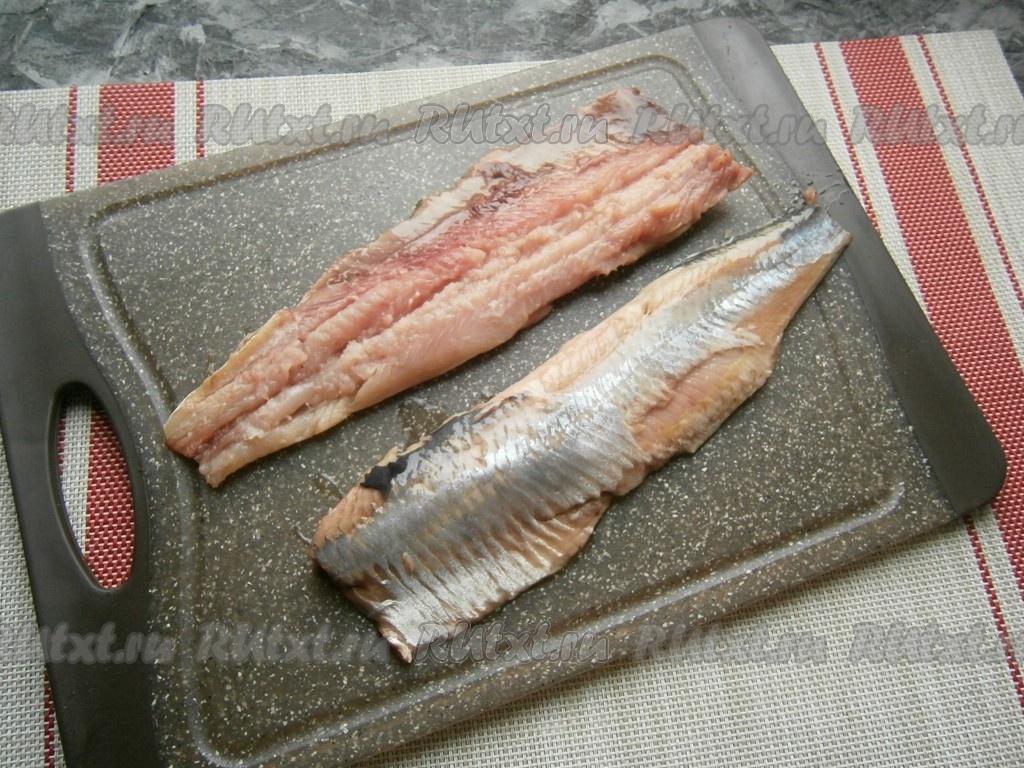 Селёдку разморозить, удалить голову, хвост, внутренности, снять шкуру, разделать рыбу на филе, удалив все крупные кости.