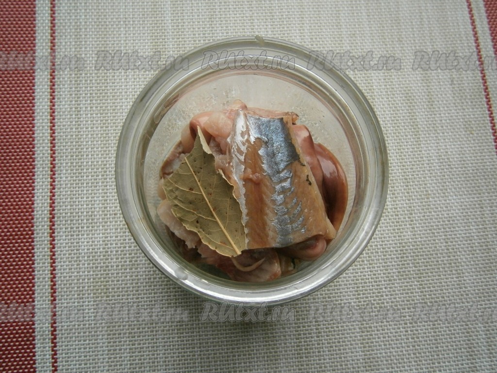 Сложить селёдку в банку объёмом 400-500 мл, добавить лавровый листик.