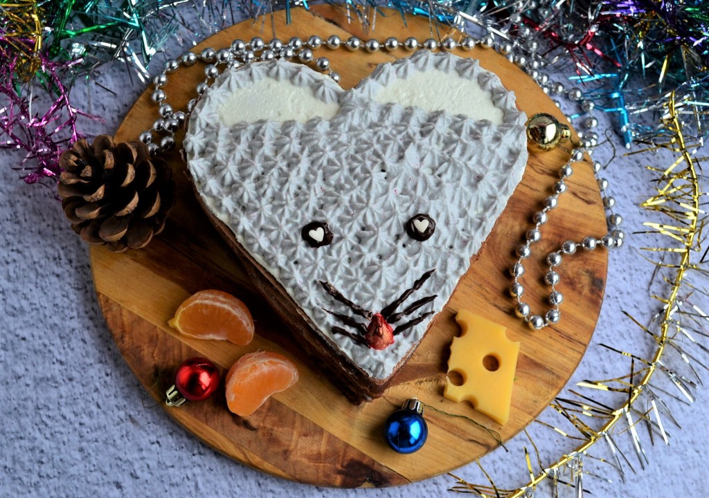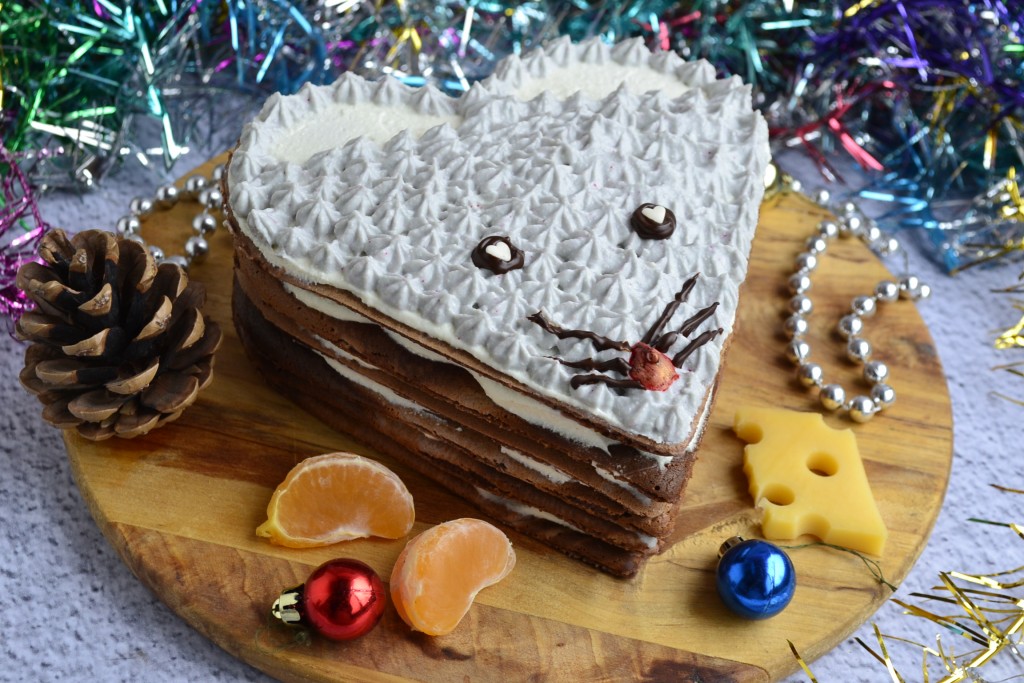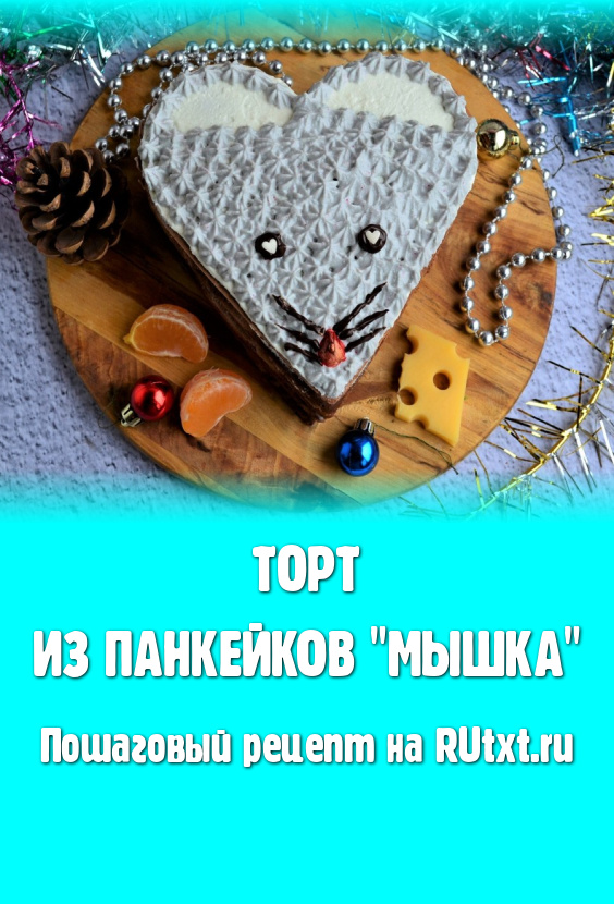 Символом наступающего 2020 года по Восточному гороскопу является Белая Крыса, а значит все грызуны тоже будут символизировать этот год. Предлагаю к новогоднему столу приготовить простой, необычайно вкусный, лёгкий торт из панкейков "Мышка". Этот тортик можно украсить кремом по-разному: если не окрашивать крем, мышь будет белого цвета, я решила окрасить часть крема в серый цвет - мордочка мышонка получилась серой. И не забудьте рядом с тортиком положить угощение для мыши в виде кусочка сыра, долек мандарина и т.п. Торт из панкейков получается небольшим, но для 4-5 человек вполне достаточно.