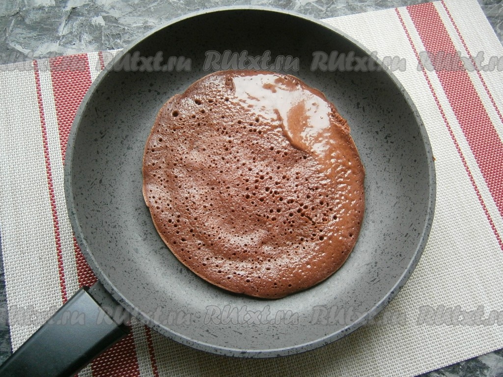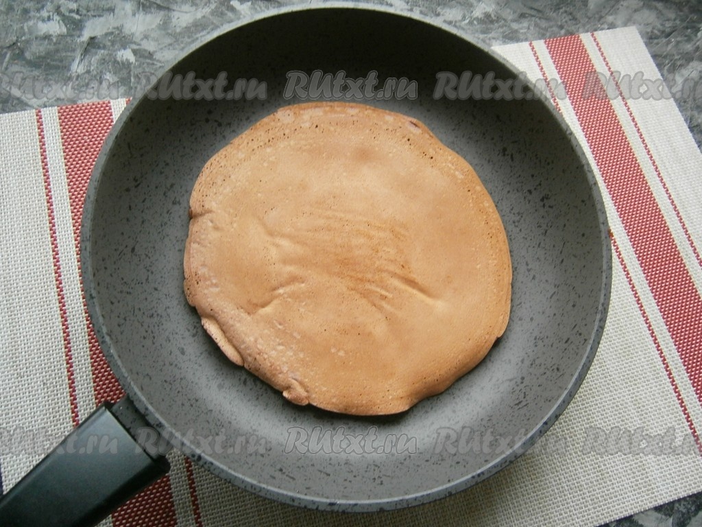 На разогретую сухую сковороду налить часть теста (панкейк должен быть почти по диаметру сковороды, у меня сковорода диаметром 24 см). Жарить панкейк на небольшом огне с одной стороны до появления характерных дырочек.