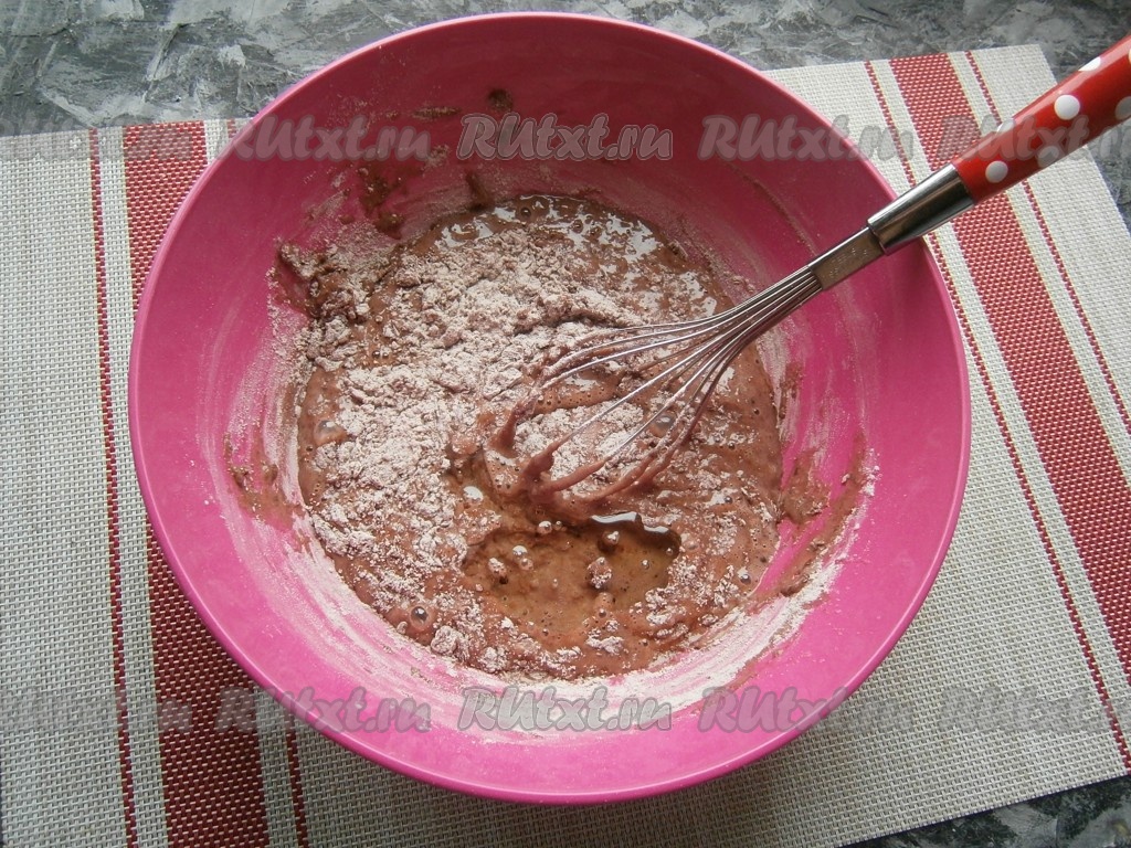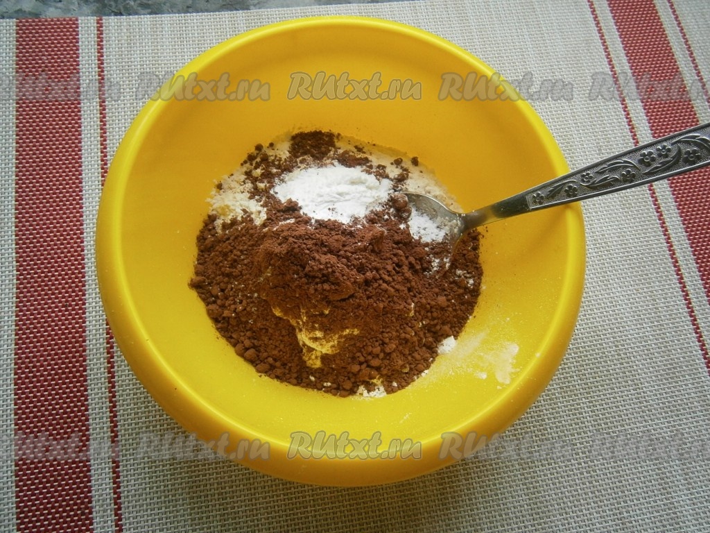 В отдельной миске муку смешать с какао-порошком и разрыхлителем.