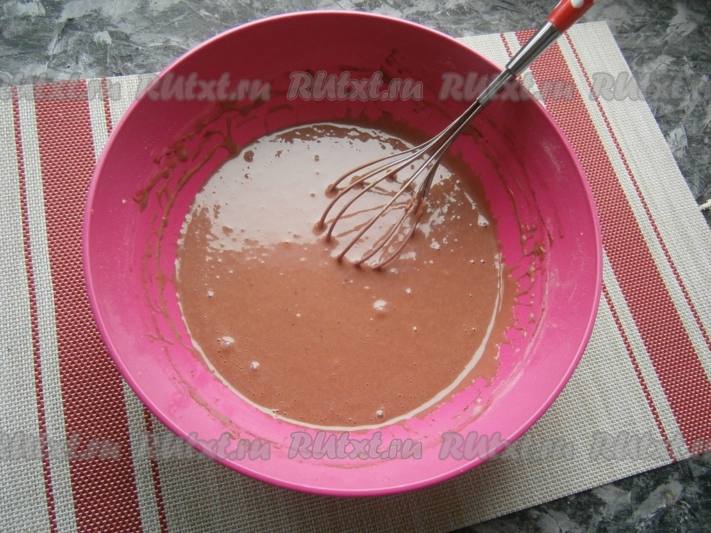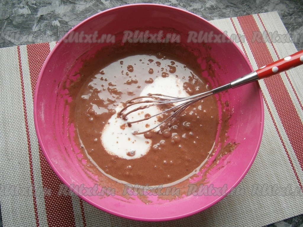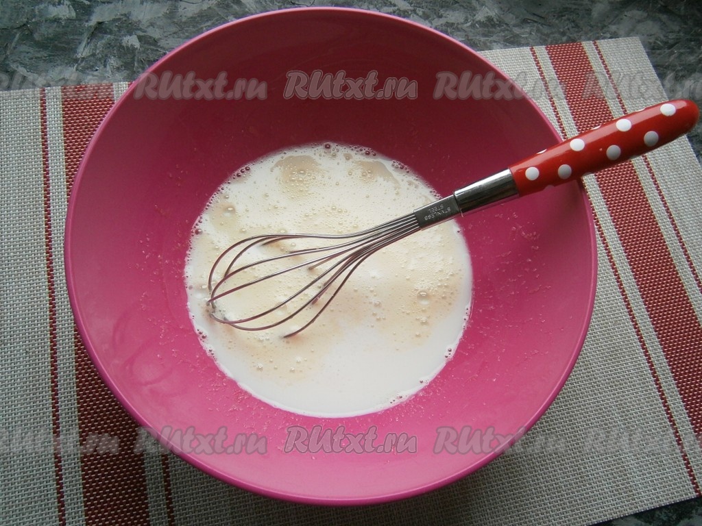 Замесить венчиком тесто, которое будет не густым, льющимся, похожим на магазинный био-кефир.
