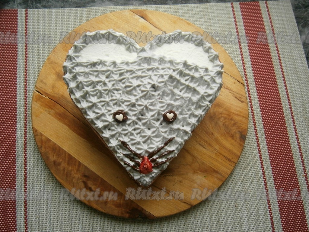 Глазки и усики нарисовать предварительно растопленным чёрным шоколадом, который поместить в кондитерский одноразовый мешок (или в уголок целлофанового пакета, обрезав кончик). Зрачки - из капель белого шоколада (или белой кондитерской посыпки), носик - окрашенная красным красителем капля из белого шоколада.