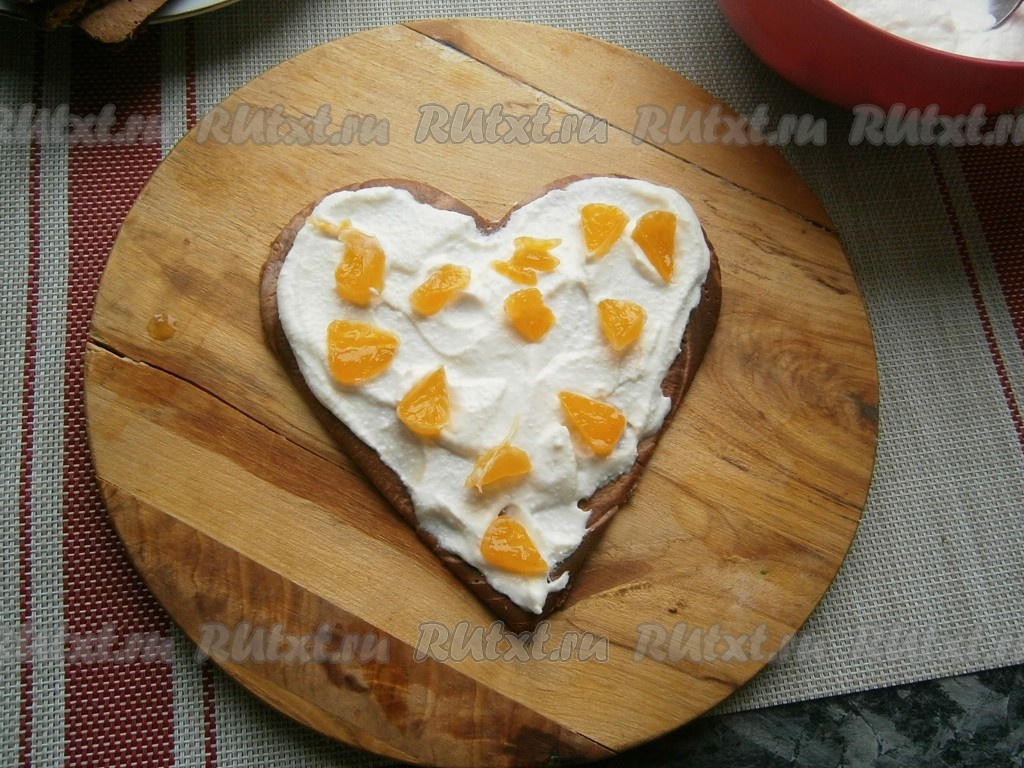 Собрать торт, для этого панкейки, смазанные творожной массой, поверх которой разложены нарезанные дольки мандарина, выкладывать друг на друга.