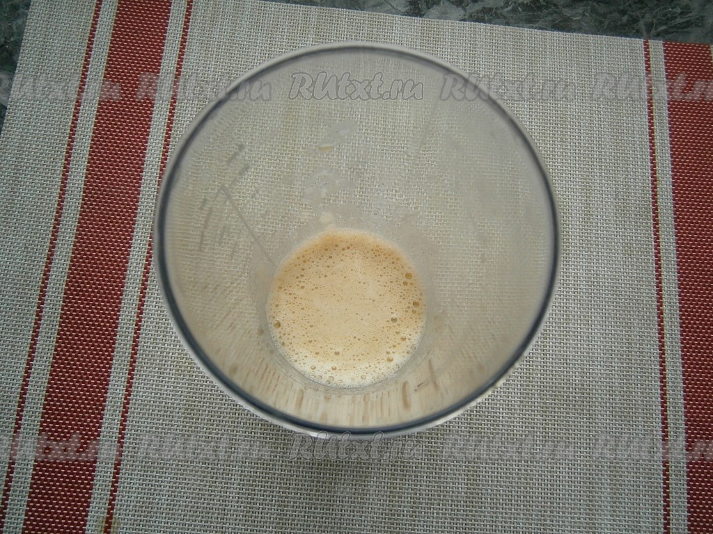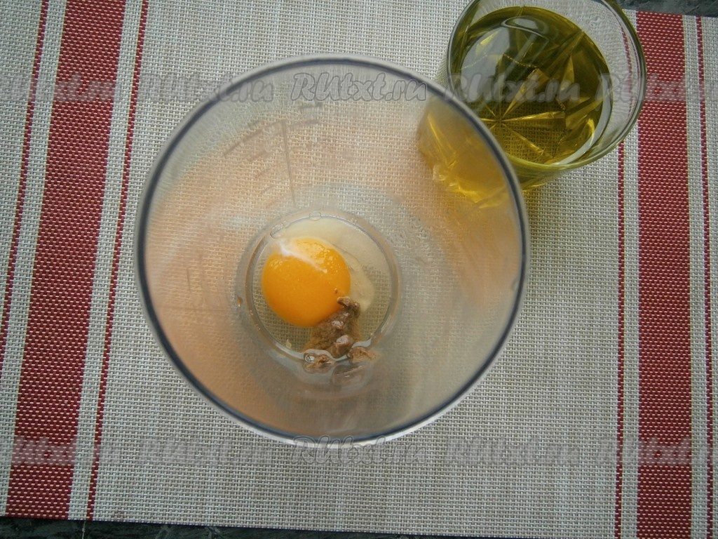 В высокий стакан блендера разбить яйцо, всыпать соль, сахар, добавить горчицу.