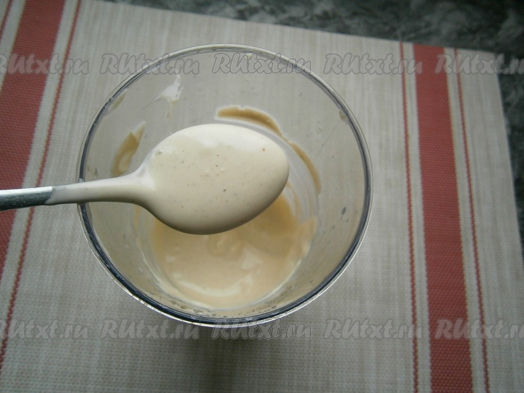 В конце взбивания, когда соус уже загустеет, добавить лимонный сок и взбивать ещё 15-20 секунд. Соус у меня получился средней густоты, как обычный магазинный майонезный соус.