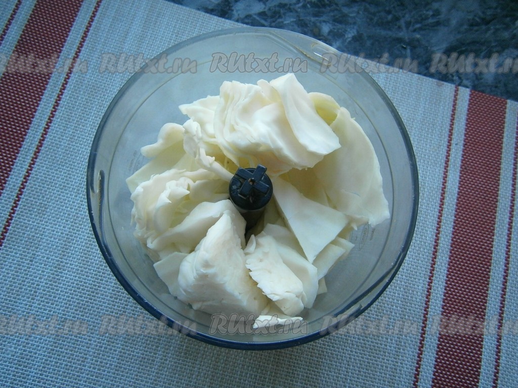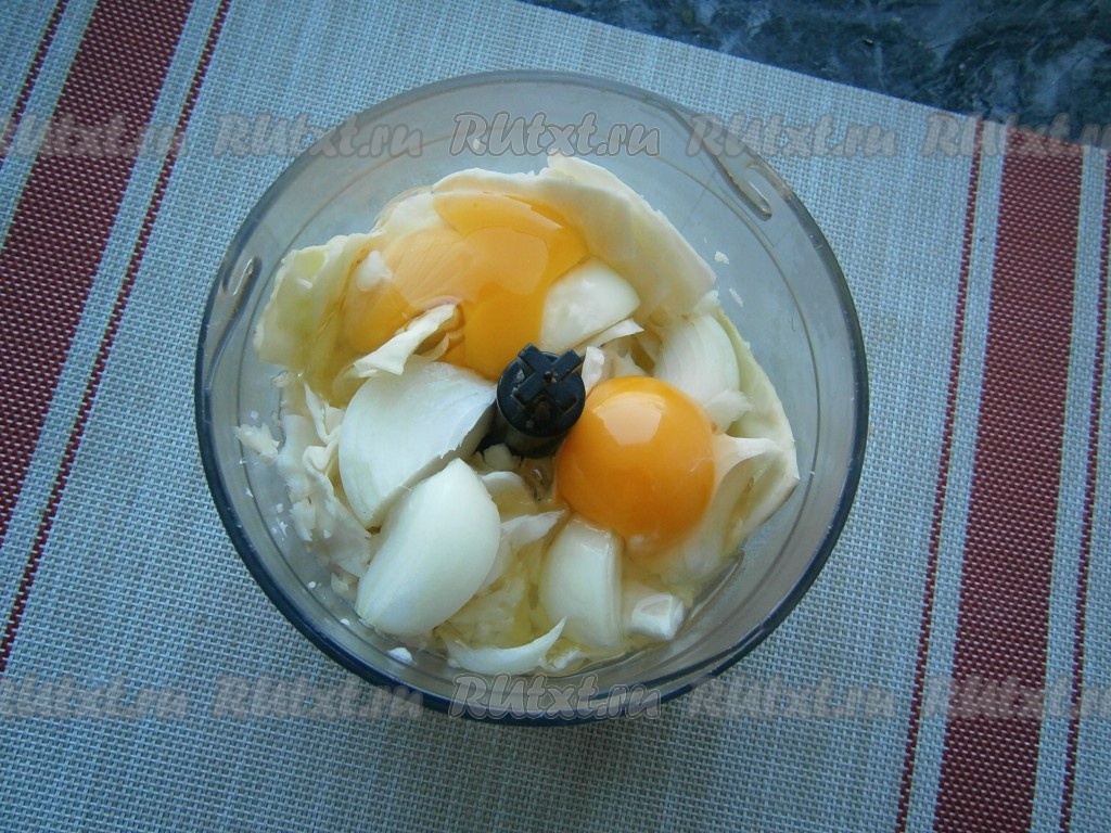 Капусту с луком и яйцами измельчить блендером до состояния кашицы.