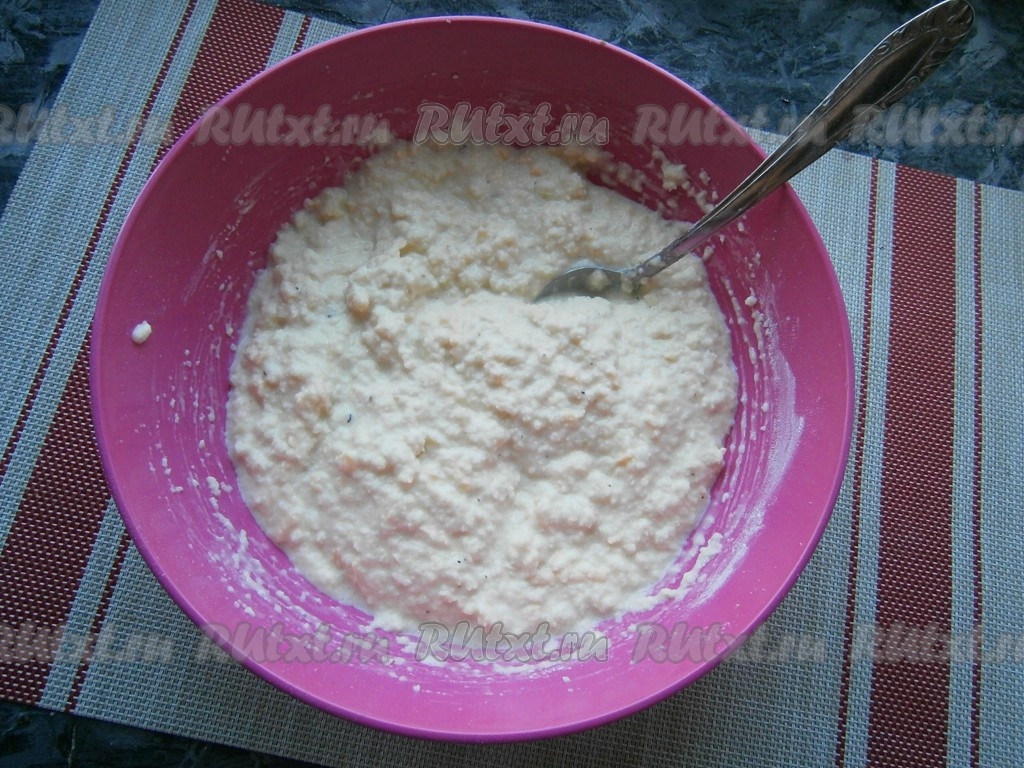 Массу перемешать, добавить муку с разрыхлителем, посолить и поперчить.