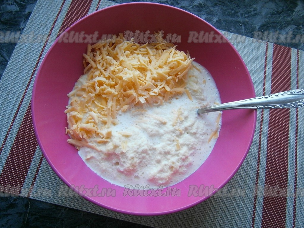 Переложить массу в миску, влить молоко (или сливки), добавить твёрдый сыр, натёртый на крупной тёрке.
