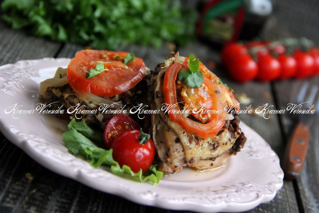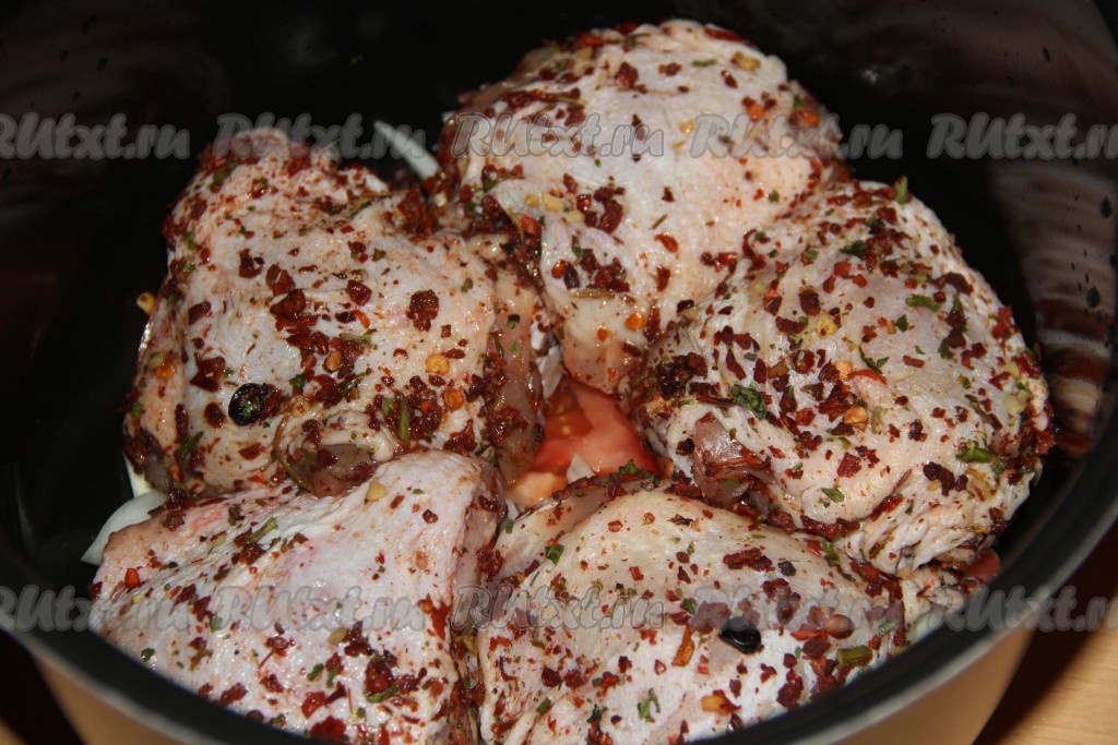 Поверх овощей в чашу мультиварки выложить куриные бёдра.