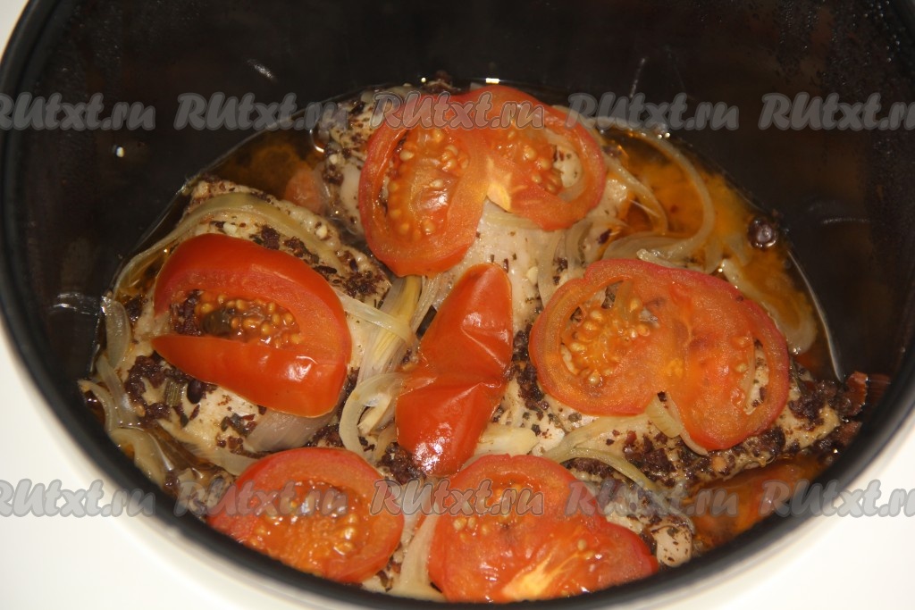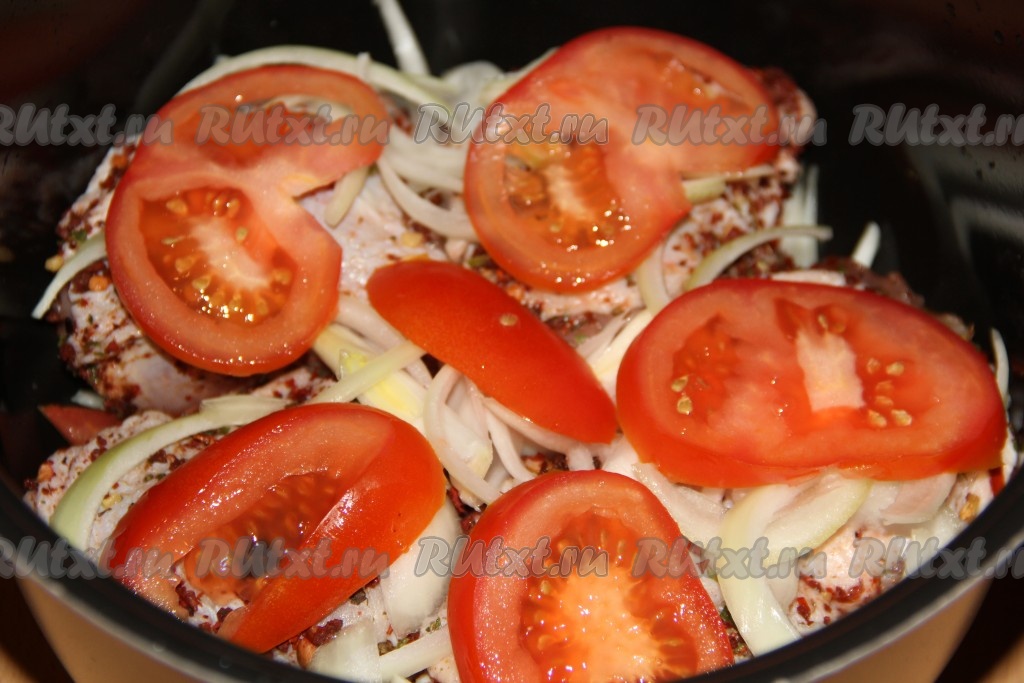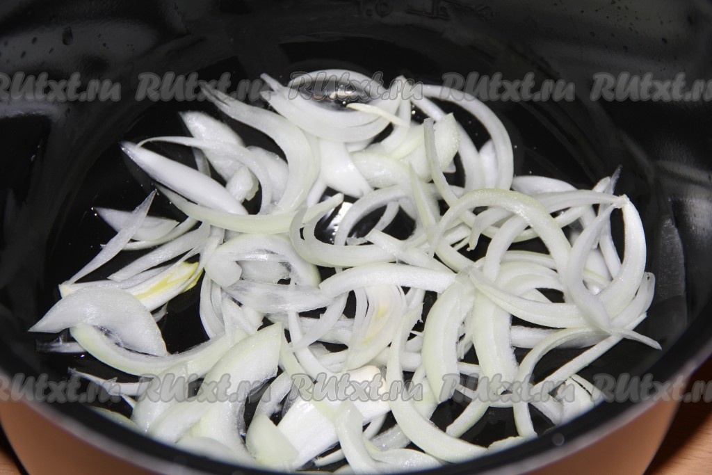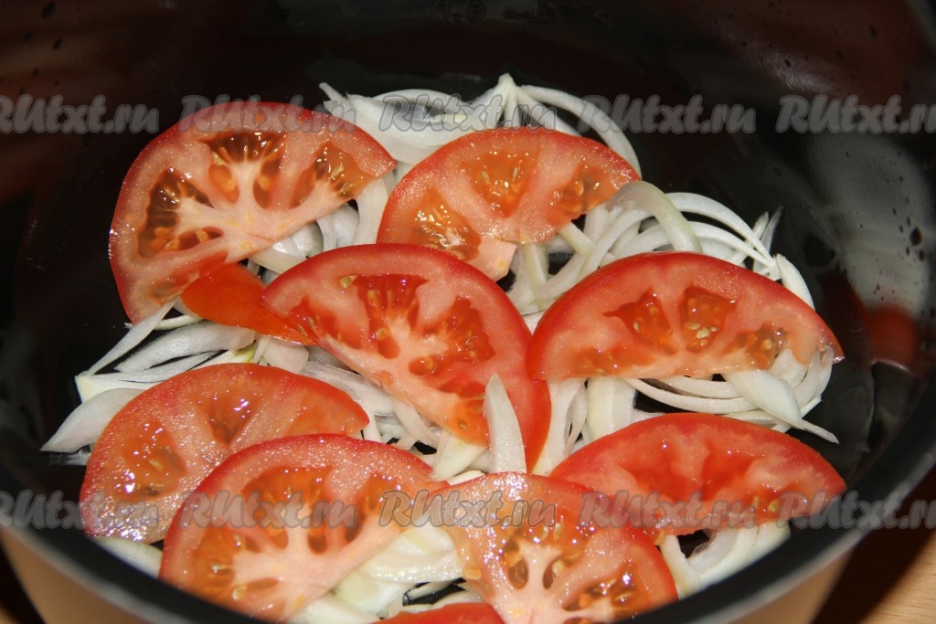 Лук очистить и нарезать тонкими полукольцами. Помидоры вымыть, нарезать на полукружки. На дно чаши мультиварки выложить половину нарезанного лука.