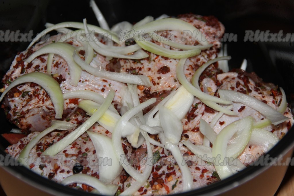 Поверх кусочков курицы разложить оставшийся лук.