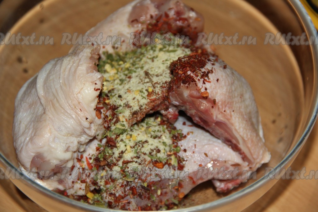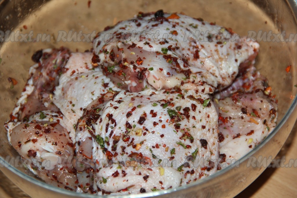 Куриные бёдра тщательно натереть со всех сторон специями и оставить мариноваться на пару часов (лучше оставить мариноваться в холодильнике на ночь).