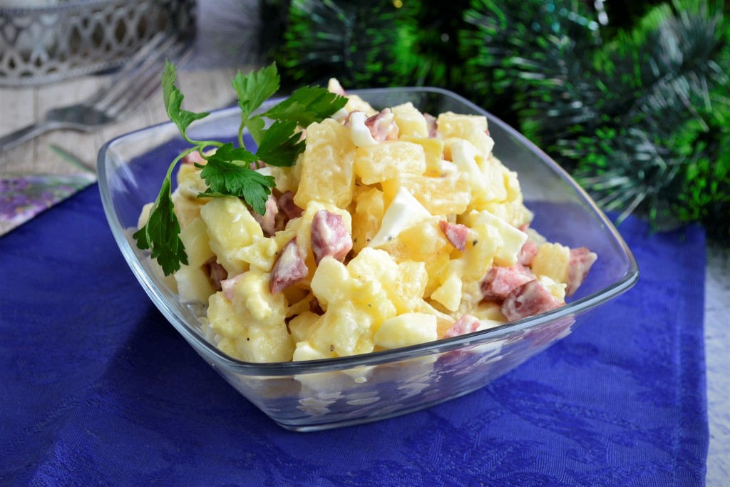 Яйца отварить в течение минут 10 с начала кипения воды. Картошку, не очищая от кожуры, варить минут 20-25 (до готовности). Затем, дав картошке и яйцам остыть, очистить их. Консервированный ананас обсушить и нарезать небольшими кусочками.