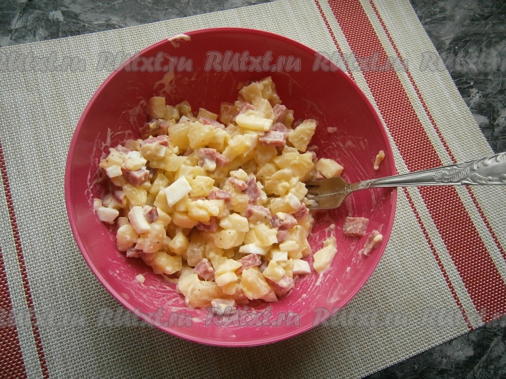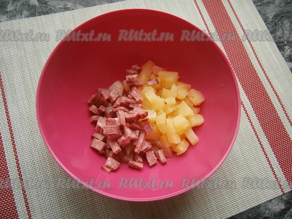 Поместить ананас в миску, добавить нарезанную кубиками копчёную колбасу.