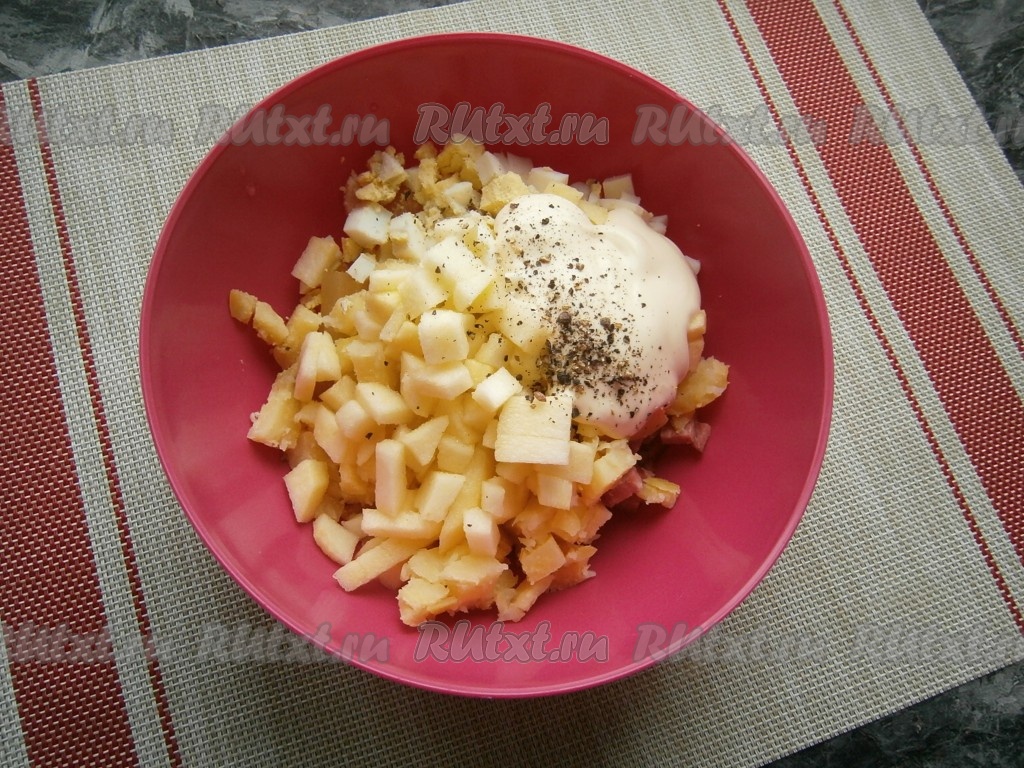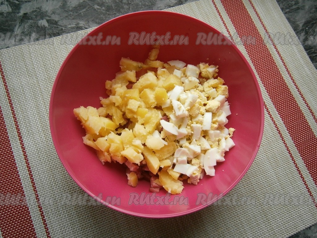 Сюда же выложить варёный картофель, нарезанный кубиками, и рубленные варёные яйца.