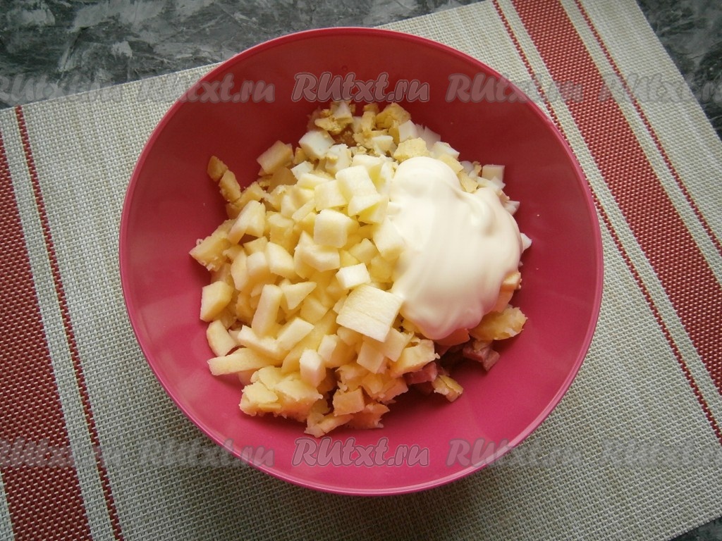 Очистить яблоко от кожуры и семян, а затем нарезать его кубиками, сбрызнуть лимонным соком и добавить вместе с майонезом в салат из копчёной колбасы, ананасов, картофеля и яиц.