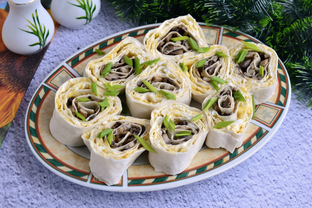 Очень вкусный рулет из лаваша, приготовленный с шампиньонами и сыром, подать к столу, посыпав сверху зелёным луком.