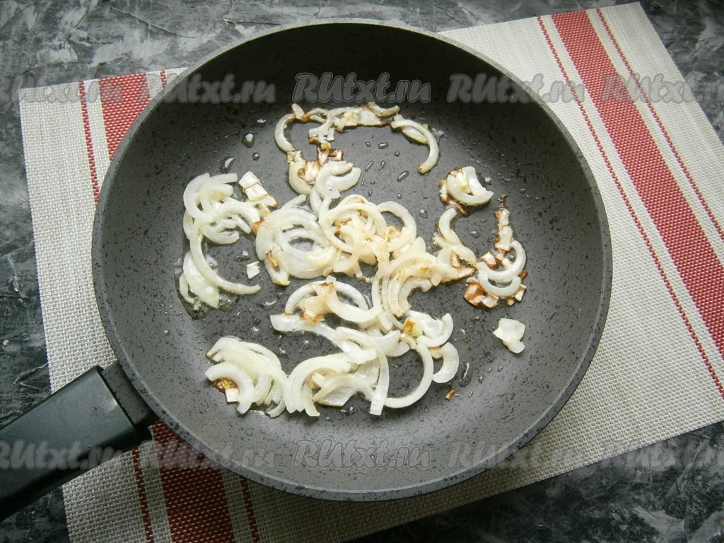 На сковороде на растительном масле обжарить на среднем огне репчатый лук в течение 1-2 минут, иногда перемешивая.