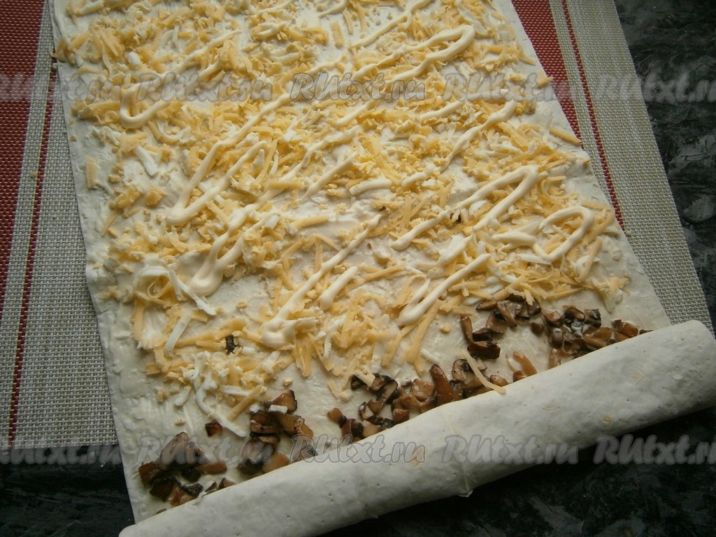 Грибы немного сверху смазать майонезом и свернуть эту часть лаваша в рулет. На другую часть лаваша выложить смесь сыра и яиц, также сверху смазать немного майонезом.