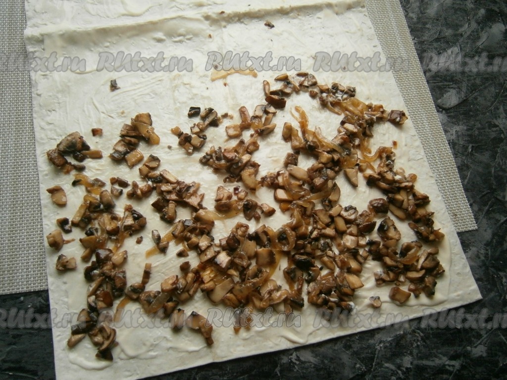 На одну половину лаваша выложить остывшие шампиньоны с луком.