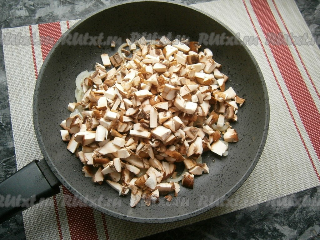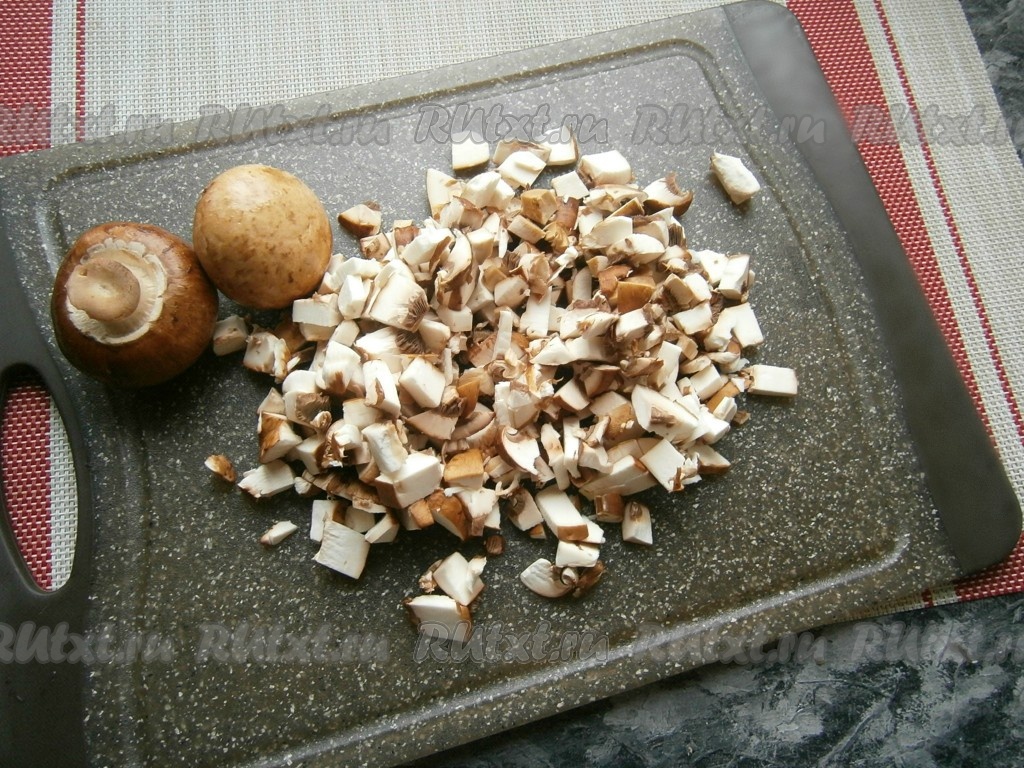 Шампиньоны вымыть, обсушить и нарезать на небольшие кусочки.