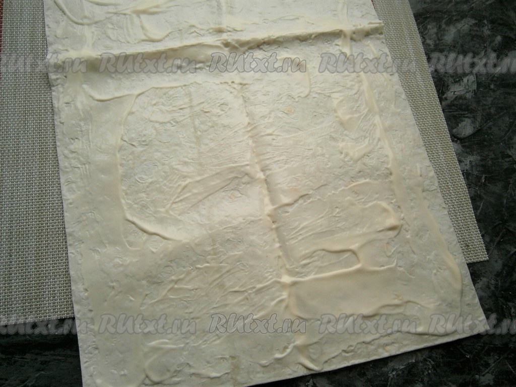 Грибы остудить, а лаваш полностью смазать слоем майонеза.