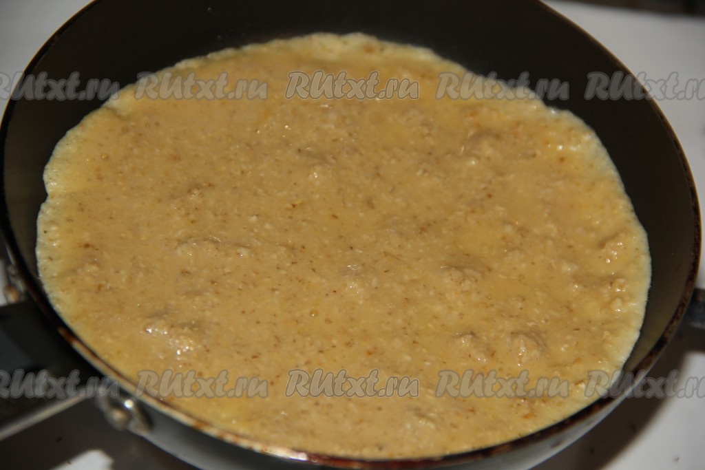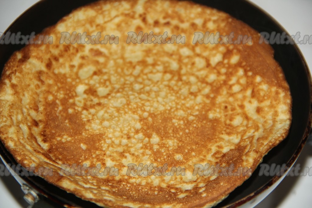 Я выпекала блины на сковороде диаметром 12 см. Можно испечь один блин размером 26-28 см. Сковороду слегка смазать растительным маслом, разогреть и влить тесто (если будете выпекать несколько блинчиков из указанного количества ингредиентов, как это сделала я, влейте на сковороду часть теста и равномерно распределите его).