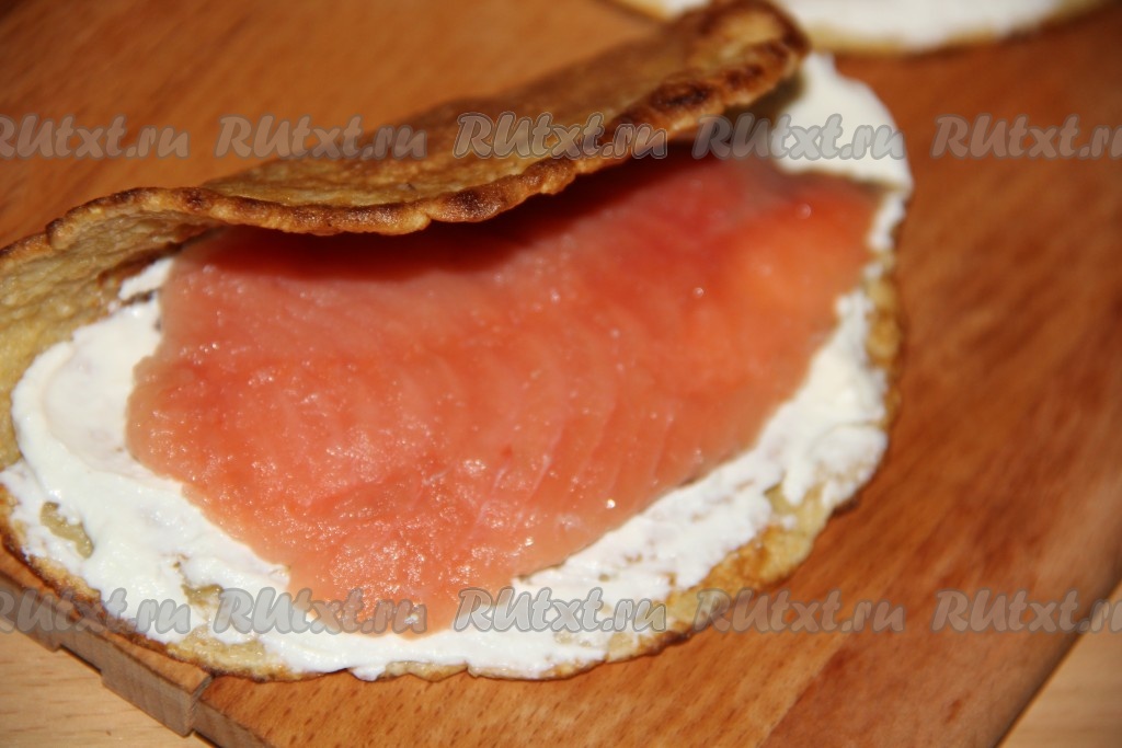На часть овсяноблина, смазанную сыром, выложить кусочек красной рыбы.