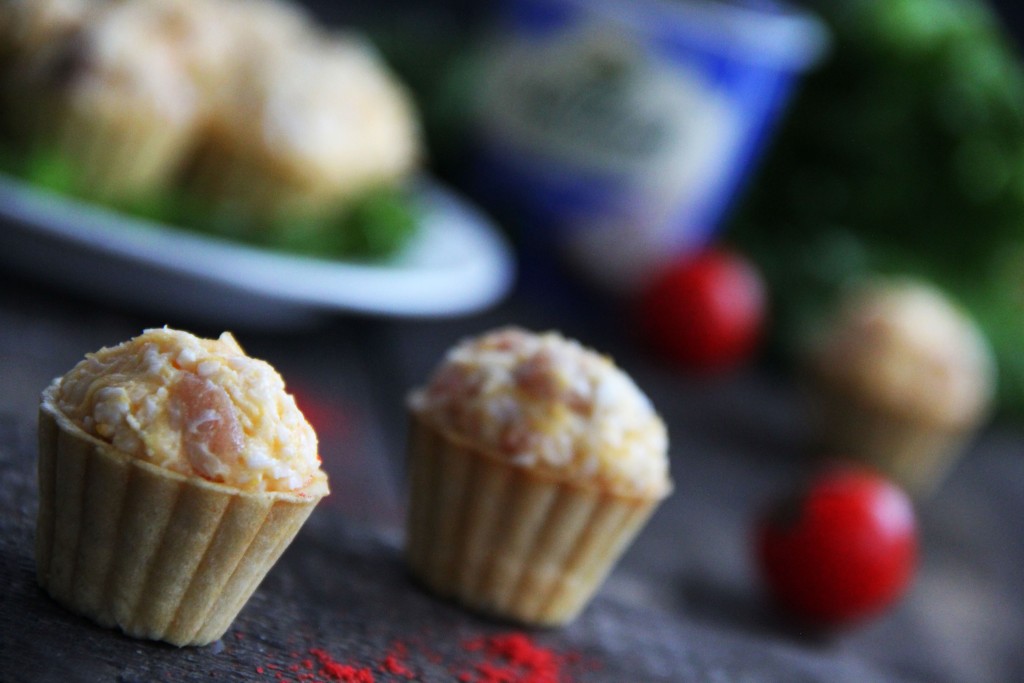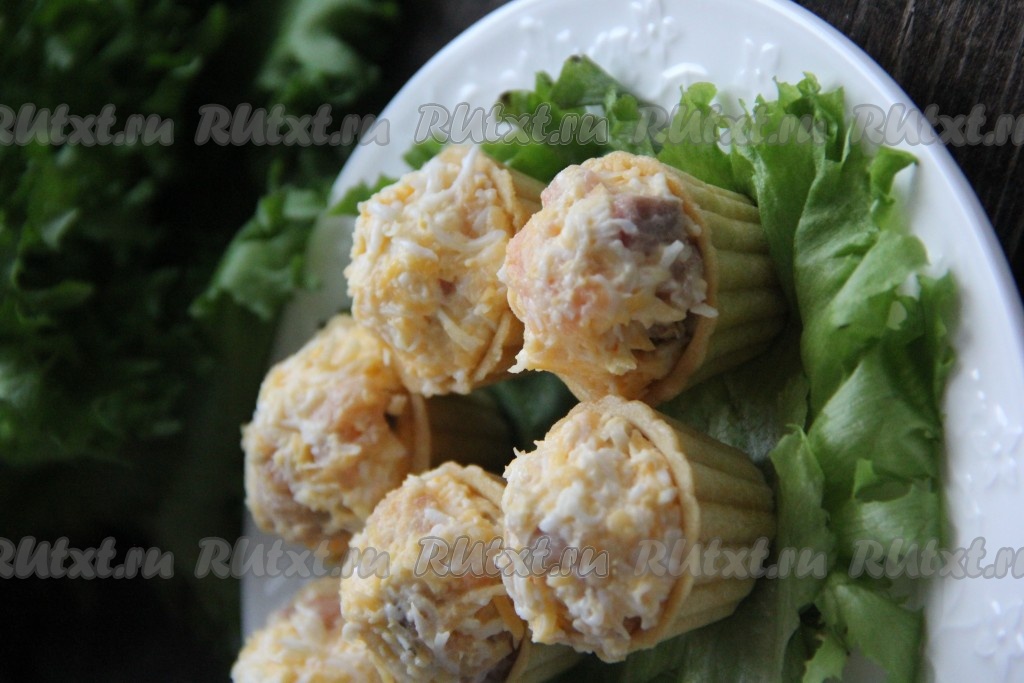 Аппетитные, очень вкусные тарталетки с солёной горбушей и сыром подать к столу.