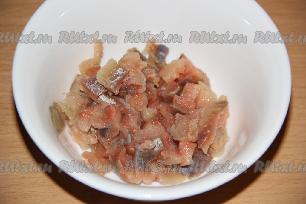 Слабосолёную горбушу нарезать на мелкие кусочки.