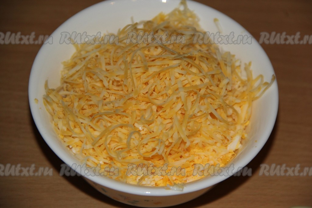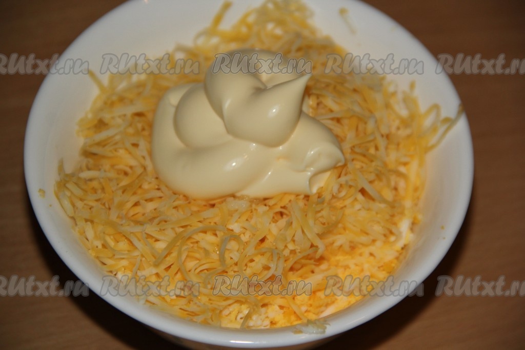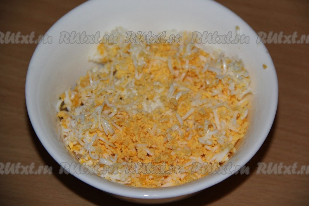 Сыр натереть на мелкой тёрке и добавить к рыбе и яйцам.