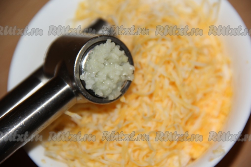 К сыру, яйцам и горбуше добавить пропущенный через пресс чеснок.
