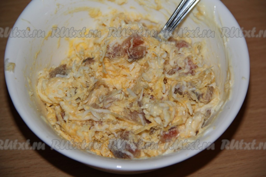 Сюда же добавить майонез. Я добавила 1 столовую ложку майонеза, нужно только чтобы начинка скрепилась.