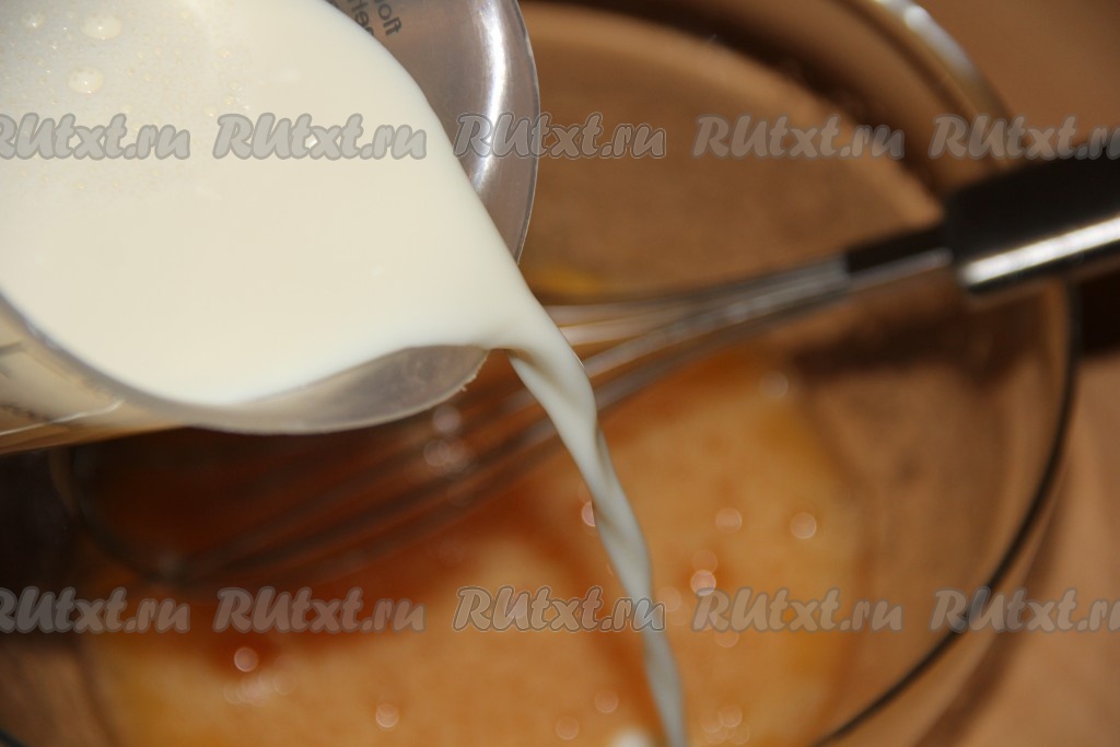 К яйцам, взбитым с сахаром и солью, влить 300 мл молока и перемешать венчиком до однородного состояния.